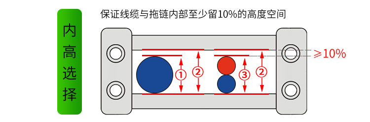 (拖鏈內高②)≥(線纜直徑①)*10%,若重疊按(重疊后實際高度③)作為線纜直徑